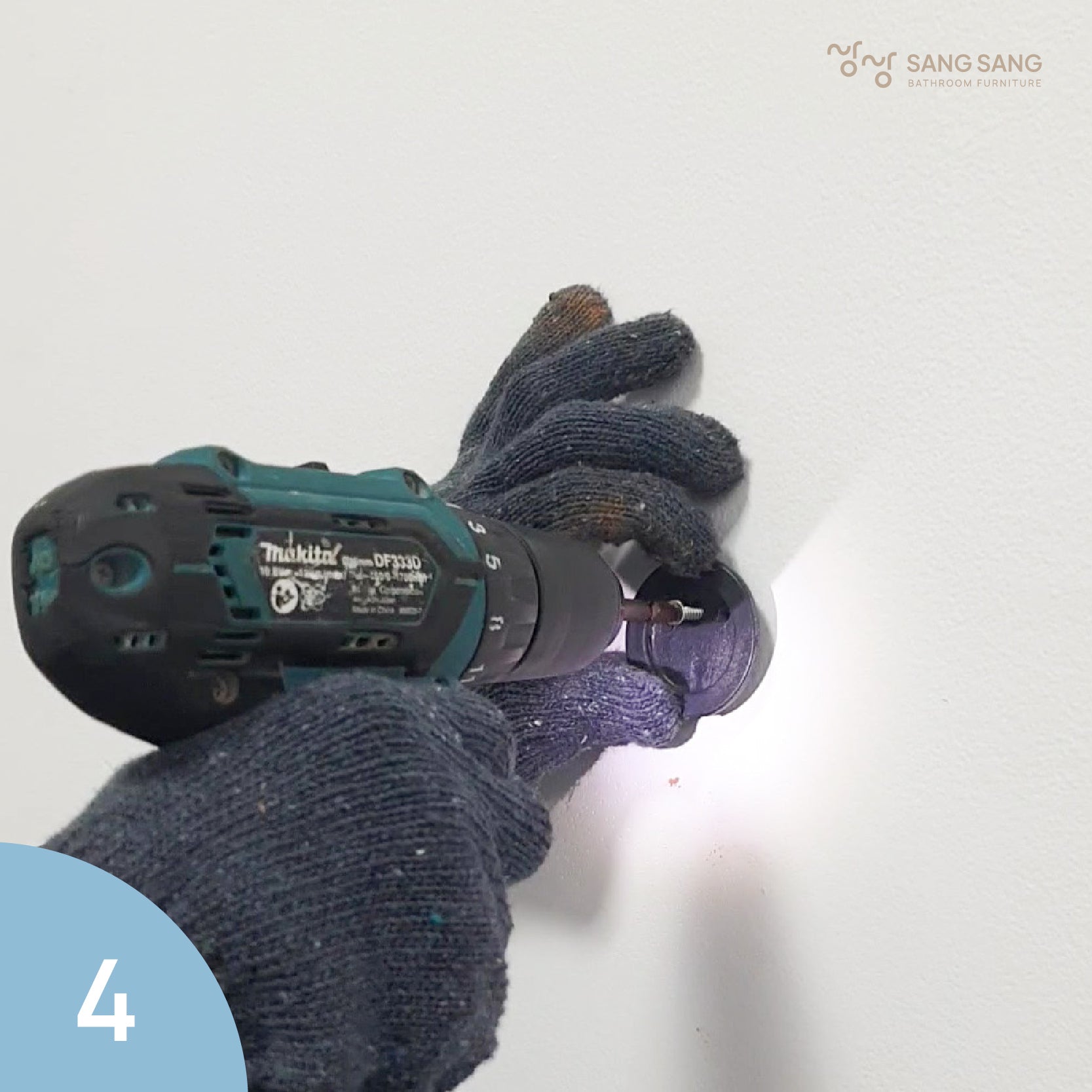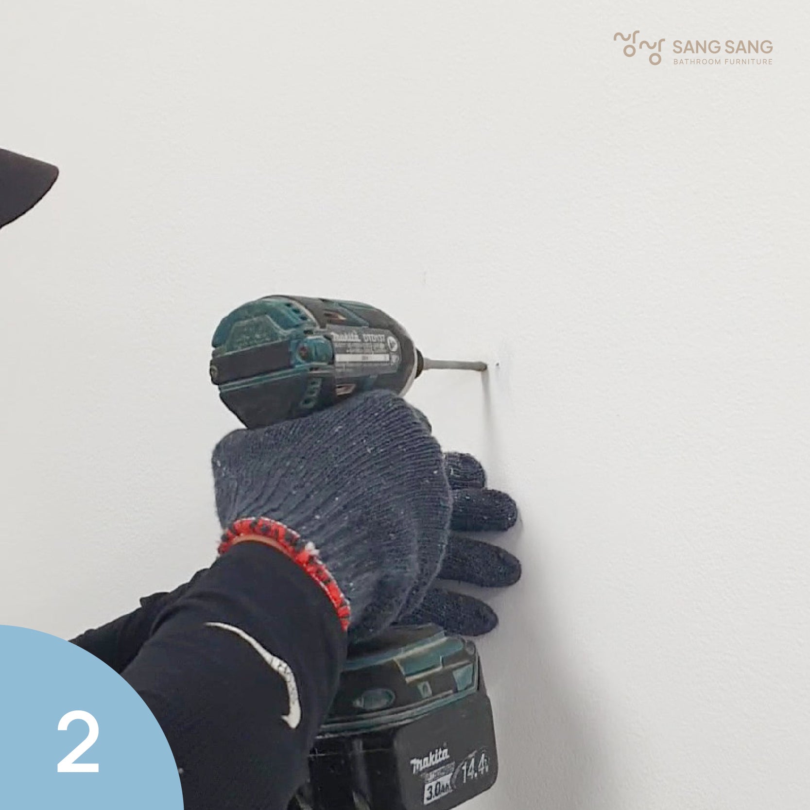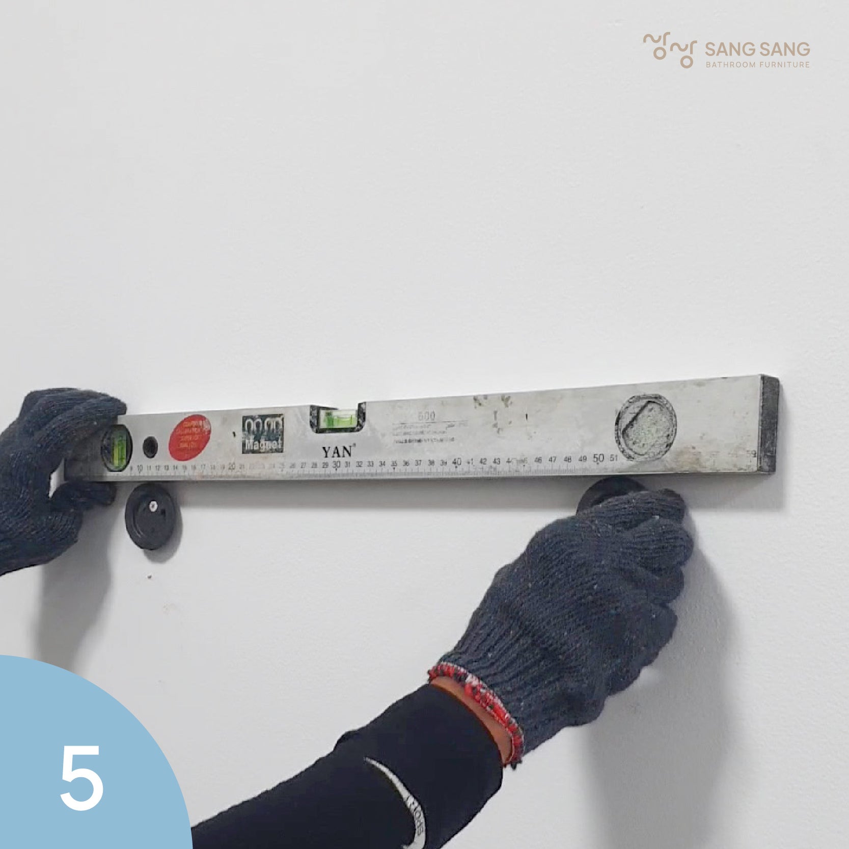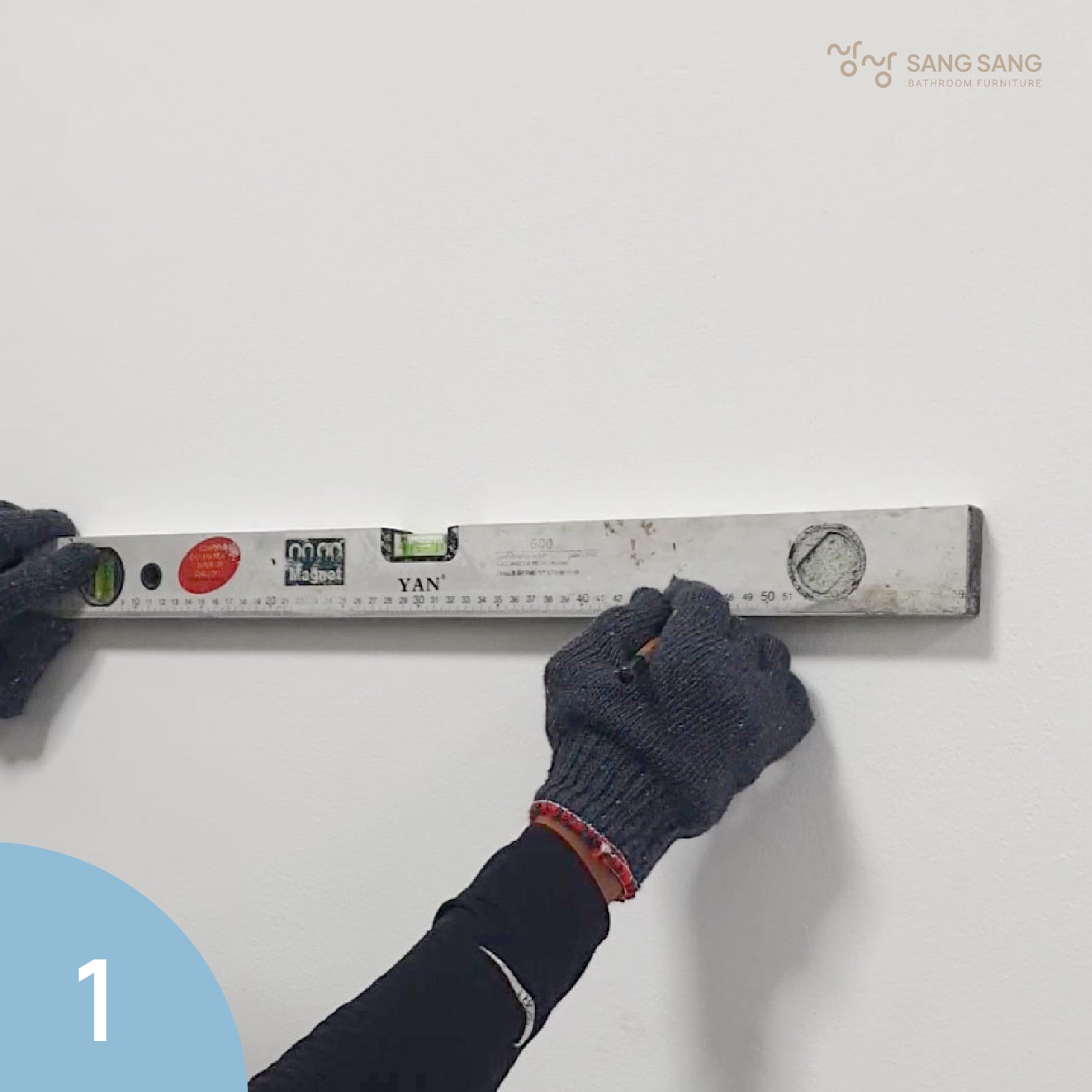 1. Check the installed location of the bathroom cabinet aligned with the horizontality. 설치한 벽에 수평을 맞춰서 구멍 뚫을 곳을 표시합니다.