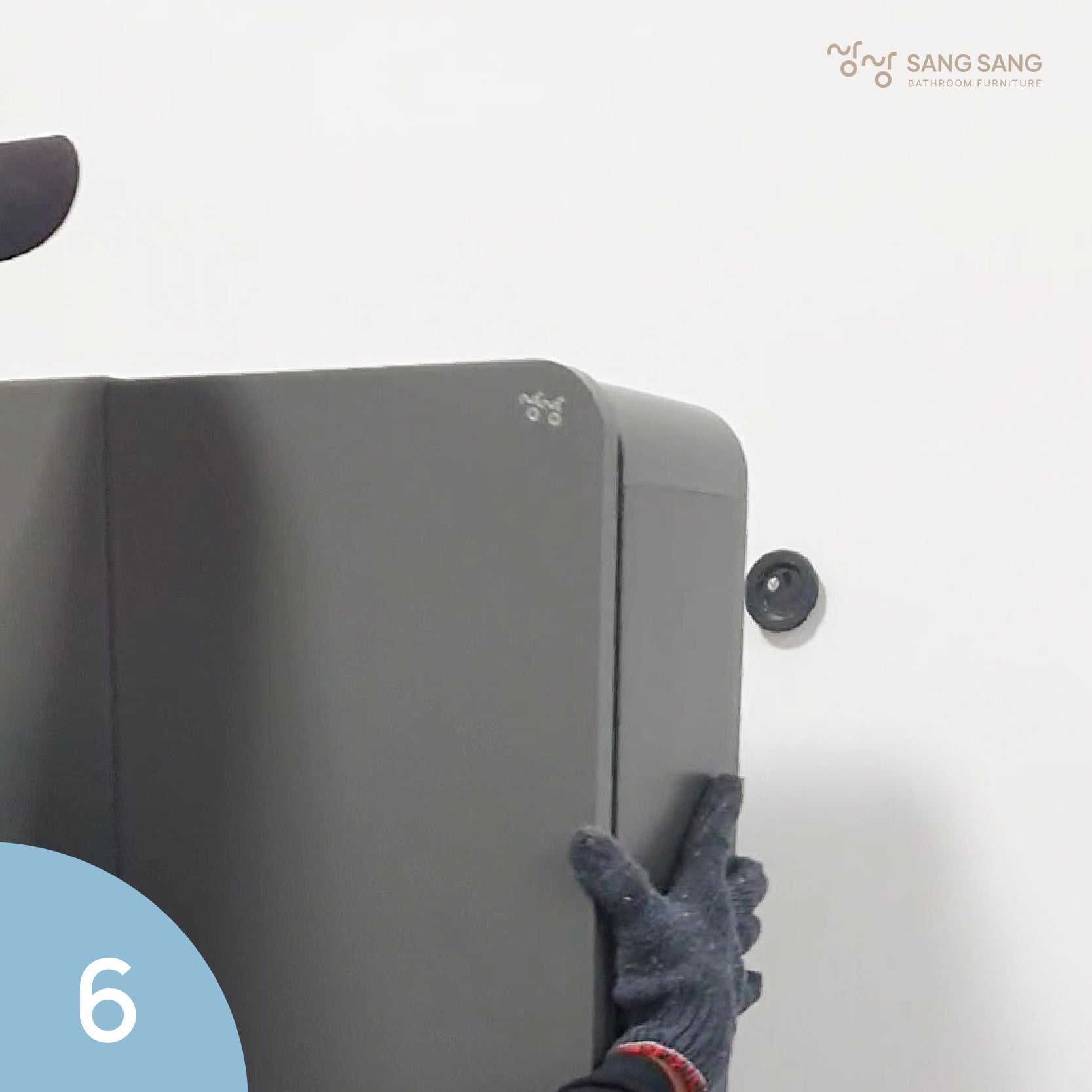 6. Hang the bathroom cabinet on the 2 brackes. 브라켓에 욕실장을 걸어 줍니다. 위에서 아래로 욕실장을가볍게 쳐주면서 브라켓에 잘 끼워졌는지 확인합니다.